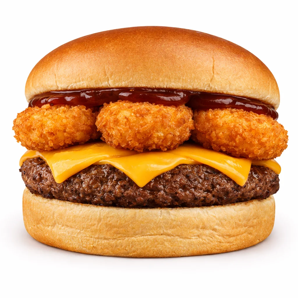 Pão brioche, molho barbecue, suculento burger de 130g grelhado na churrasqueira, queijo cheddar e TRÊS deliciosos nuggets !!!! - acompanha molho